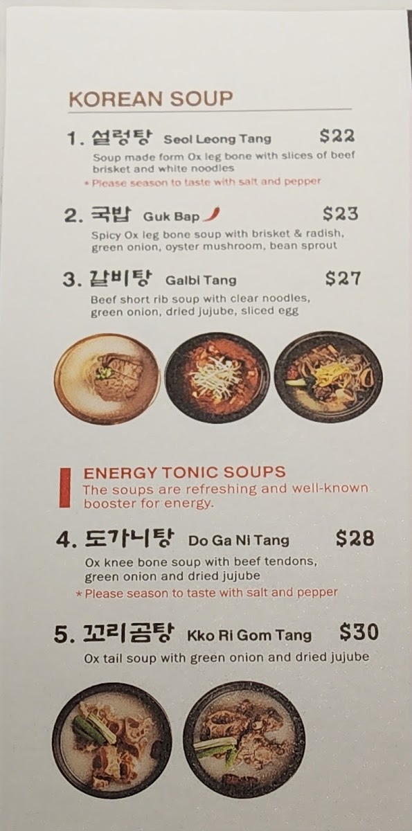 “ Quite pricy but worth it. We got a beef rib stew, cold noodles, and beef bone soup with tendons. The beef rib stew seemed smaller than other places but I like how they put in different kinds of vegetables. The beef is braised thoroughly, flavorful and very soft. On the other hand, the cold noodles portion was very generous. The soup tasted really refreshing with slices of pear for extra texture and sweetness. Their kimchi side dishes are prolly my favorite. They were crunchy and savory. Side note: We arrived when they just opened, and got in right away. But when we finished, there seems to be many people waiting. ”